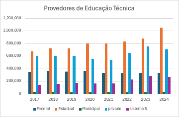 Apesar de todas a incertezas, as matrículas em cursos técnicos aumentaram significativamente no Brasil desde então, passando de 1.7 para 2.3 milhões entre 2017 e 2024. Destes, um terço estão em escolas estaduais, e outro terço em escolas privadas. O terceiro terço é dividido em proporções parecidas entre os Institutos Federais, o Sistema S (SENAI, SESI) e o Centro Paula Souza, do Estado de São Paulo. Olhando para as áreas de formação, se nota que 60% dos alunos estão em cursos de Gestão e Negócios, Ambiente e Saúde, e Informação e Comunicação, e mais 11% na área de produção industrial, que tem mais importância para o sistema S e institutos federais.